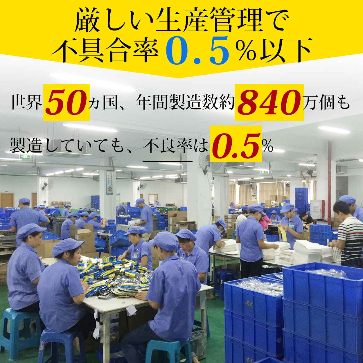 CE ISO 9001 ISO 14000 Reach STMC の取得、これに伴う検査を実施済、一例としてCE資格取得に際し、EMCテスト、Reach資格取得に際し、SVHCテストを実施しております。 工程上の検査としては、 ①組み立て検査(各部品の位置の確認)、②完成製品から抜き取り検査(印刷、液漏れ、チップ検知などの確認)、③梱包作業検査(ラベル仕様、梱包材仕様などの確認)、④出荷作業検査(型番、色、数量、ロット番号など資料との確認) この他に当社提携倉庫内で、工場の上記工程上の検査の他、倉庫到着後、万が一の運送途中での破損がないかを日本人スタッフが再度、検査して不具合品を除去、不具合品を流通させない仕組みを築いています。